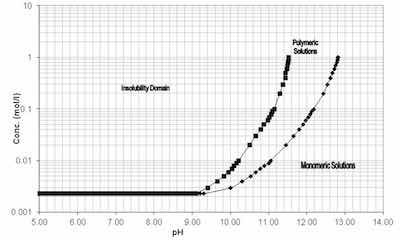 To prevent the scenario that leads to the phase of irreversible precipitation, the solution pH should be monitored and maintained with the addition of hydroxide (NaOH or KOH) at a pH level dependent on the solution concentration.29