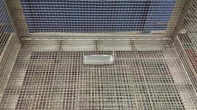 Figure 8 - Small part in large basket.Alkaline etch cleaning has a much higher pH and is intended to perform aluminum metal removal using predetermined etch rates combined with process recipe immersion times. This process involves intended and unintended chemical reactions that need to be understood so that contamination as a result of part processing is known. Below are likely balanced mechanistic chemical reactions for aluminum parts when processed with a formulated alkaline solution containing sodium sulfide.