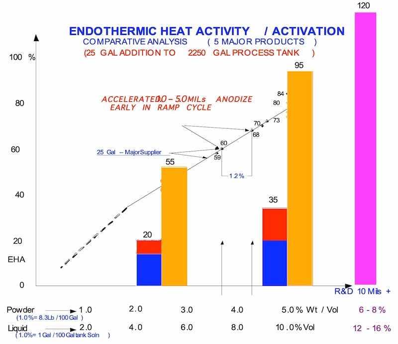 Three particular companies working with these concepts have initiated surface activation and anodizing as low as 1-3 volts on 1500-3000 amp production loads immediately after positive buss bar contact has been made. The excess endothermic energy removal was initiated faster and much more efficiently (100% - 300%) using APCD and concentrated Amino Activated Modifiers.
