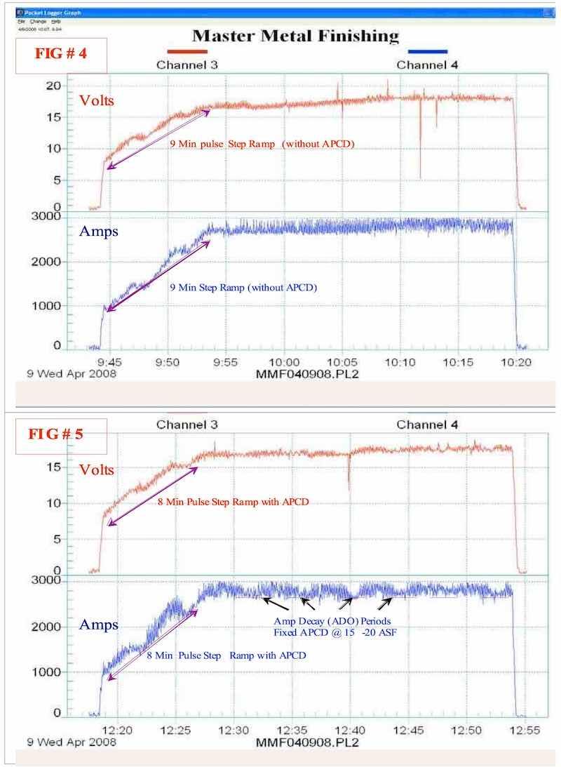 A new tank load of the same panels was run with APCD and recorded as Fig 5. Please note the increased high current Pulse during the ramp cycle with a dramatic Amperage Decay (ADO) at 2400 Amps. The ADO can only indicate accelerated anodize build up which is totally due to APCD. In addition, the large ADO periods during constant current density ranging is a direct indication of a faster anodize coating rate, due to the fixed APCD to the end of the process cycle. This increased the coating rate by 25%-50% without any increase in voltage. The APCD operation here should be reviewed and stressed as related to increased current density, Amperage Decay (ADO) and pore structure development at lower current density.