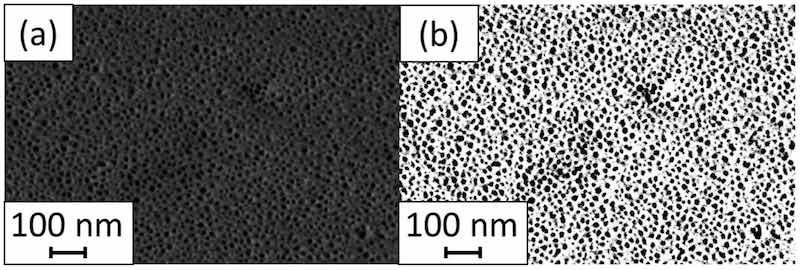 Figure 1. Example of SEM in-lens secondary electron image showing surface morphology of 2024 alloy after 45 min anodizing before (a) and after (b) threshold operation in ImageJ software (version 1.53e, National Institute of the Health, MD, USA).