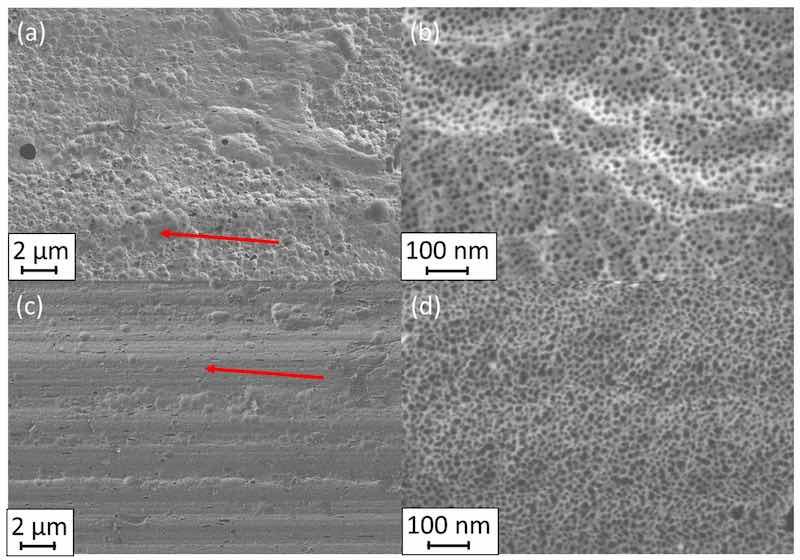 Figure 2. SEM surface morphology of 2024 after anodizing in TSA for 25 min (a,b) and 45 min (c,d). Red arrows point out different surface morphologies.