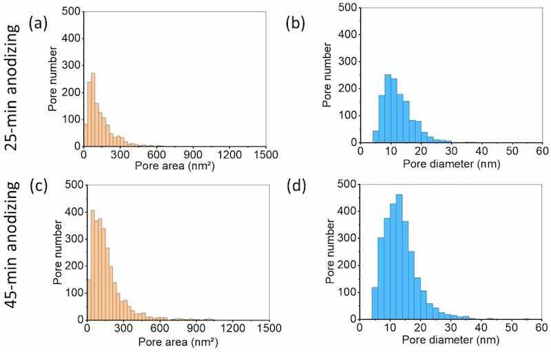 Figure 3. Data distribution of measured pore area and pore diameter calculated in approximation of a circular section for 2024 after anodizing in TSA for 25 min (a,b) and 45 min (c,d).