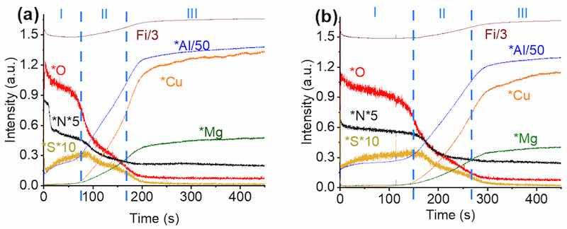 For both samples, three distinct parts can be defined on the profiles, which can be tracked by the signals of specific elements. The anodized layer (part I) is evidenced by the O and S plateau. In the substrate alloy (part III), Al and alloying elements (Cu, Mg) are maximized while O and S signals are at the level of their background. The transition zone between the oxide layer and the substrate alloy (part II) is relatively long reflecting a relatively rough interface between the layers. The Al plateau signal is low in the oxidized layer (part I), and it increases at the interface to reach a high intensity plateau when the substrate erosion occurs. Signals from the alloying elements are quasi zero in the oxide zone and follow a similar trend as Al in the interface and the substrate, confirming the presence of magnesium or copper in the bulk alloy.