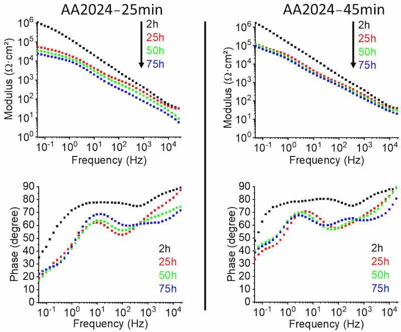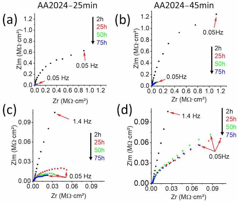 EIS measurements were conducted to describe the evolution of the oxide properties. Examples of Nyquist plots of 25 min and 45 min anodized samples of 2024 (named as 2024–25 min and 2024–45 min), obtained after 2 h, 25 h, 50 h and 75 h of immersion in 0.01 M NaCl aqueous solution, are displayed in Figure 6.