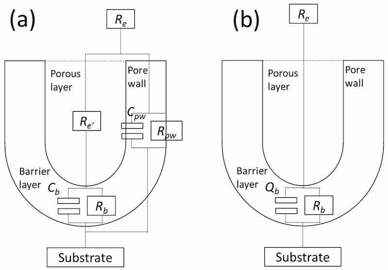 Equivalent Circuit were used to go further into the interpretation of the impedance data. The general model used in the literature for anodic layer is represented in Figure 8a [4,10,31]. Re corresponds to the electrolyte resistance; Re’ is the resistance of the solution inside the pores; Rpw is the resistance of the pore walls, and Cpw is the associated capacitance. As the porous wall resistivity is high and prevents the current transport, the RC couple Rpw/Cpw can be neglected. Because of the unsealed pores, the Re’ value is very low so the model can be simplified to the schema presented in Figure 8b.