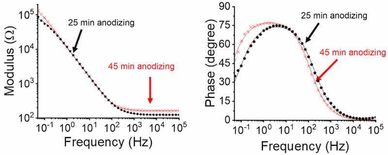 Interpretation of the EIS data allows the attribution of this improvement not to the increase of the thickness of the porous layer but to the improvement of the barrier layer which could be due to its densification or its thickness increase.