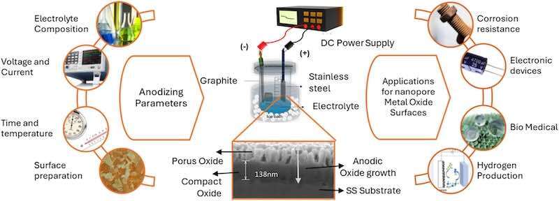 Compared with conventional valve metals such as aluminum or titanium, stainless steels present greater complexity due to their multicomponent composition and stable passive films. Recent progress, including dual-step anodization, optimized electrolytes, and targeted post-treatments has made it possible to form robust, self-organized nanoporous oxides with controlled morphology and thickness.
