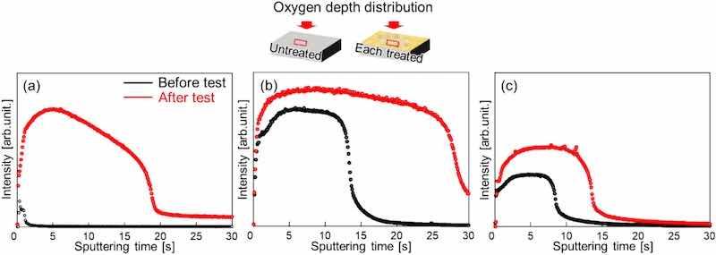 Fig. 12. Oxygen distribution from the surface to the depth of the (a) UT, (b) WJP-treated, and (c) MFC-treated samples.