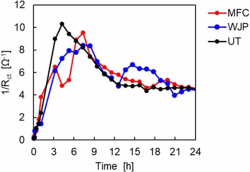 The time variation of the reciprocal of Rct was analyzed (Fig. 8). Each treated sample showed a large Rct compared with that for the UT sample for up to 6 h, indicating that corrosion proceeded more slowly. However, this difference gradually diminished and Rct eventually matched that for the UT sample.