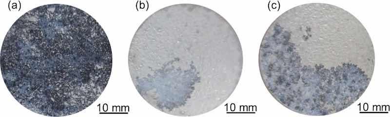 Fig. 10. Surface photographs of (a) UT, (b) WJP-treated, and (c) MFC-treated samples after combined cycle testing. The blue-white color is the chloride that adhered after the cycle test.