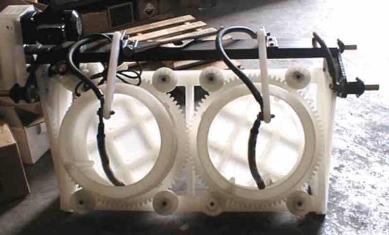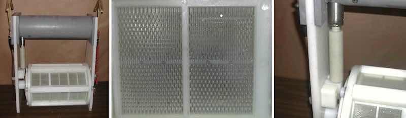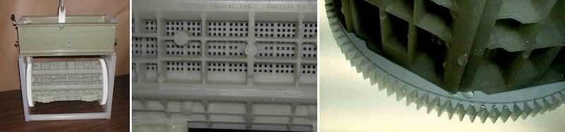 - Unique Feature(s): Ribbed walls increase strength while allowing areas with holes to be made thin. Gear driven on both sides for better distribution of torque. However, the teeth on the gears are a large source of dragout. Square holes help break surface tension of solutions to allow better drainage.
