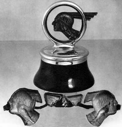 Figure 1 - Radiator cap/hood ornament for a 1930s Pontiac showing the original copper electroform configuration.In the early years of automotive finishing, practice was more art than science. Yet, scientific principles were important. A classic example is a radiator cap/hood ornament from a 1930s vintage Pontiac, shown in Fig. 1. While much of the knowledge germane to its manufacture has been lost with the years, certain facts are known. The ring and cap was a single zinc-based die-casting and was plated with single layers of copper, nickel and chromium. The trademark visage of Chief Pontiac was actually built up by copper electroforming. The electroform consisted of four pieces: The two halves of the head inside the ring and of the stylized headdress outside it. The assembly was completed by brazing, and a final bronze-tint lacquer finish was applied to the Indian head.