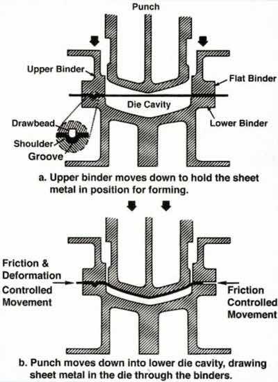 The basic principles of double-action stamping process are shown in Fig. 11. The upper die half contains two elements: The upper binder and the punch. These are complemented in the lower half by the binder and die cavity, respectively. As the die is closed, the upper binder lowers to the outer rim of the sheet metal blank to hold it in place. The punch continues downward to form the part. During forming, sheet metal is drawn from the binder area into the cavity. The rate of metal flow is controlled by friction. Excessive friction can lead to tearing, while insufficient friction can cause wrinkling. Any chromium plating would have an influence on this friction.