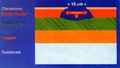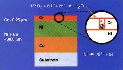 The primary layers in determining corrosion performance are nickel and chromium. These metals constitute a sacrificial corrosion cell that delays penetration to the substrate. Anodic to the chromium, the nickel corrodes. Manipulation of the structure and properties of these layers led to major improvements in appearance and performance.