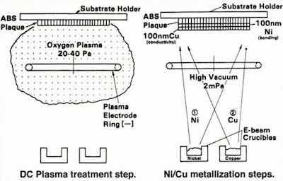 Figure 4 – Schematic representation of the vacuum preplate process for ABS plastics.In the 1960s and 1970s, there was a drive in the auto industry toward weight reduction for fuel economy, which led to the replacement of many zinc die-castings and steel parts with plastics. The primary resin of choice was acrylonitrile-butadiene- styrene (ABS). Its structure was a dispersion of butadiene particles in a matrix of acrylonitrile-styrene. To accommodate customer tastes, the article still required the lustrous metallic appearance provided by decorative chromium plating.