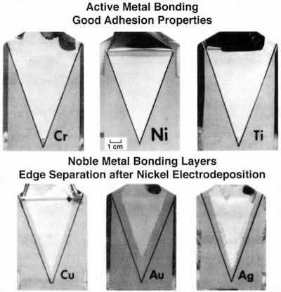 The choice of the metal for chemical bonding required an analysis of the entire multilayer system.5 Although the preplate layer might adhere to the plastic, survival of that bond through the remainder of the plating processes was by no means assured. As shown in Fig. 5, different candidate metals responded in different ways. Patterned plating was a design alternative. Using a mask to pattern the deposit, we were able to discern effects at an exposed interface. Certain active metals, such as nickel or chromium, performed well.