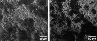 Figure 7 - Response of surfaces to stretch draw forming: (a) basal plane parallel, (b) basal plane near perpendicular (SEM: 1000×).Early on, we noted that the crystal structure and morphology of zinc could be manipulated by adjustment of hydrodynamic and chemical factors - in particular, the pH. The primary character of the surface is a predominance of hexagonal crystal platelets, about 5-10 μm in size and 1-5 μm thick. The platelets are oriented randomly with respect to the plane of the sheet, as shown in Fig. 6. The flat hexagonal faces, in crystallographic terms, are the basal (0001) planes.