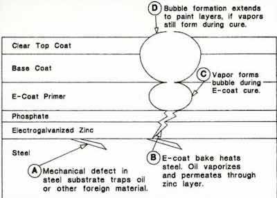 After the electrocoat process, the remainder of the painting process is relatively unaffected by the presence or absence of the electrogalvanized layer. However, there was one instance of a paint defect which, on analysis, clearly illustrated the interdependence of all of the elements and processes in this system.