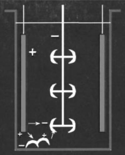 Parts dropped into a plating tank can also yield bipolar conditions, as shown in Fig. 1. The dropped parts, located near an anode, will develop a negative charge near the anode and a positive charge farther away. That means the dropped parts may act as undesirable “auxiliary” anodes at the bottom of the tank.