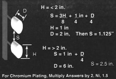 We must also realize that each contact between the rack and the part can carry only about 10 amperes during plating. Figure 2 is a guide developed by the Belke Company for proper part spacing on a rack. Note that the figure requires the application of a multiplication factor for nickel and hexavalent chromium plating.