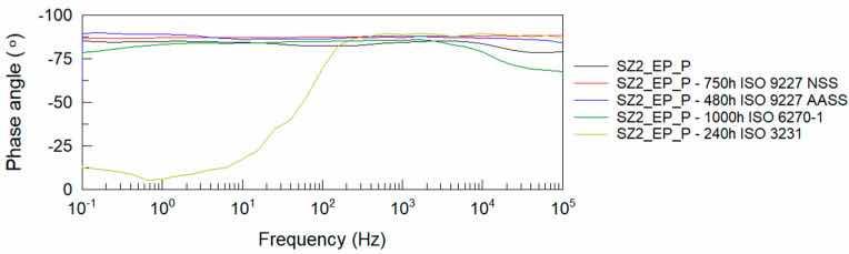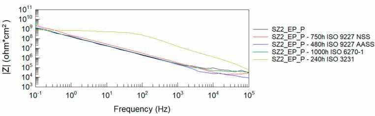 From the Bode impedance modulus plots for the polyester single coating system, it can be observed that the greatest effect on the reduction of the coating’s barrier properties is due to humidity exposure at 1000 h and NSS neutral salt spray exposure at 750 h. The least effect on the impedance level of the polyester coating is observed when tested in a humid atmosphere containing SO2. These results correlate with the evaluation of coating damage according to ISO 4628-2 ÷ 5 and with the assessment of damage according to ISO 4628-8 (coating delamination and corrosion) around the artificial damage. For the EP + P two-coating system, the greatest effect on the reduction of the coating barrier properties is observed after exposure to a humid atmosphere containing SO2.