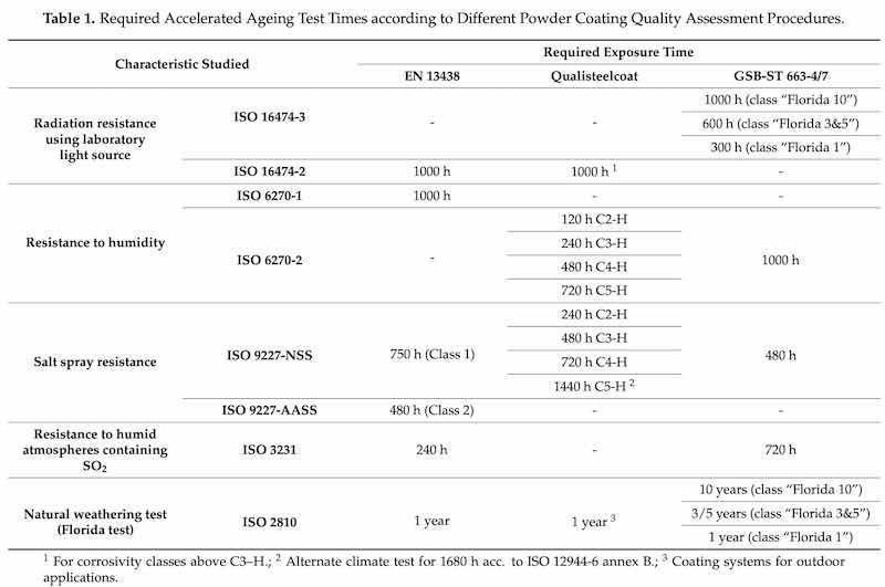 Table 1: Required Accelerated Ageing Test Times according to Different Powder Coating Quality Assessment Procedures.