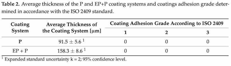 Table 2: Average thickness of the P and EP+P coating systems and coatings adhesion grade determined in accordance with the ISO 2409 standard.