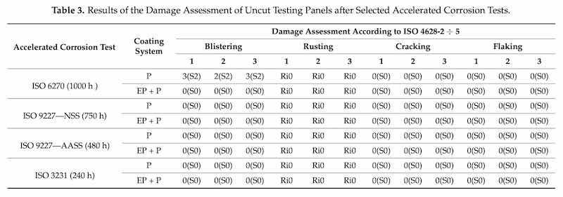 Table 3: Results of the Damage Assessment of Uncut Testing Panels after Selected Accelerated Corrosion Tests.