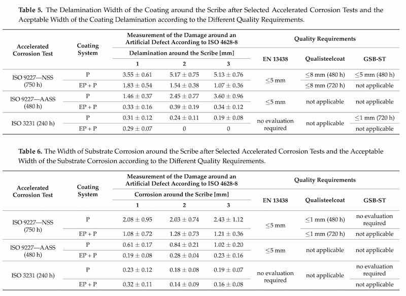 Table 5: The Delamination Width of the Coating around the Scribe after Selected Accelerated Corrosion Tests and the Aceptable Width of the Coating Delamination according to the Different Quality Requirements. Table 6: The Width of Substrate Corrosion around the Scribe after Selected Accelerated Corrosion Tests and the Acceptable Width of the Substrate Corrosion according to the Different Quality Requirements.