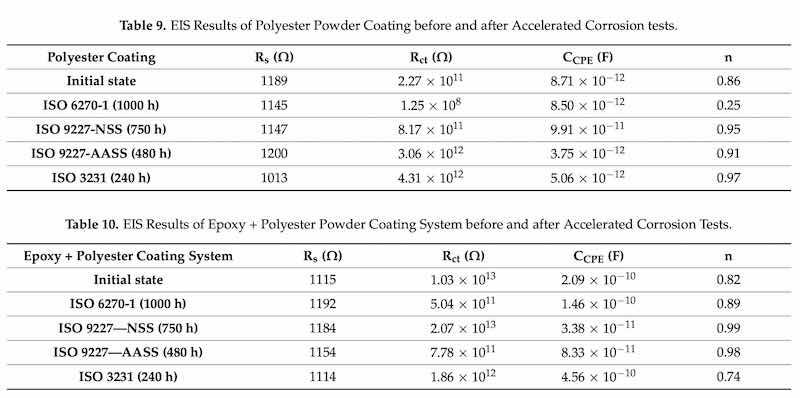 Table 9: EIS Results of Polyester Powder Coating before and after Accelerated Corrosion tests. Table 10: EIS Results of Epoxy + Polyester Powder Coating System before and after Accelerated Corrosion Tests.