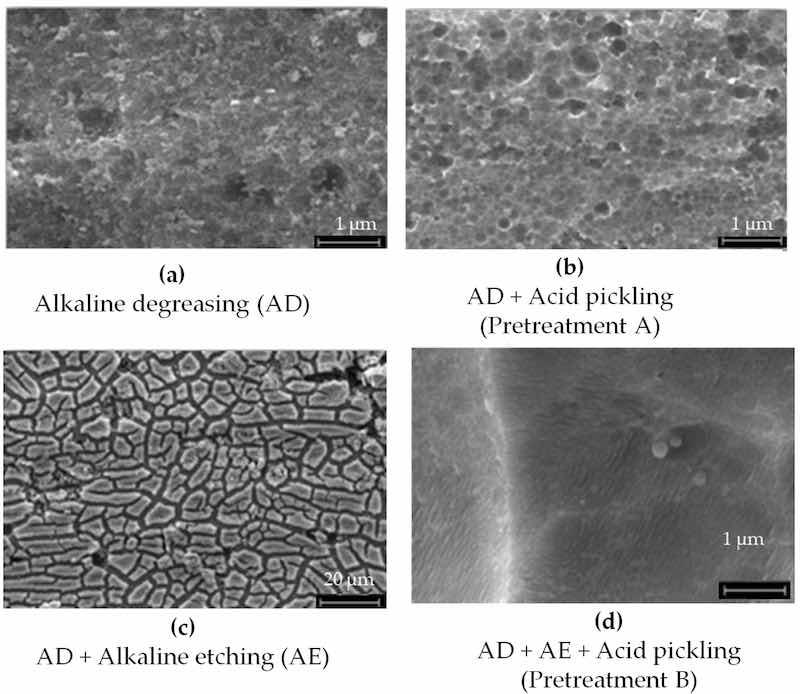 The aluminum alloy AA 2024 was analyzed before the pretreatment to determine intermetallic nanoparticles’ surface morphology and composition and again after the pretreatment, anodizing, and sealing.