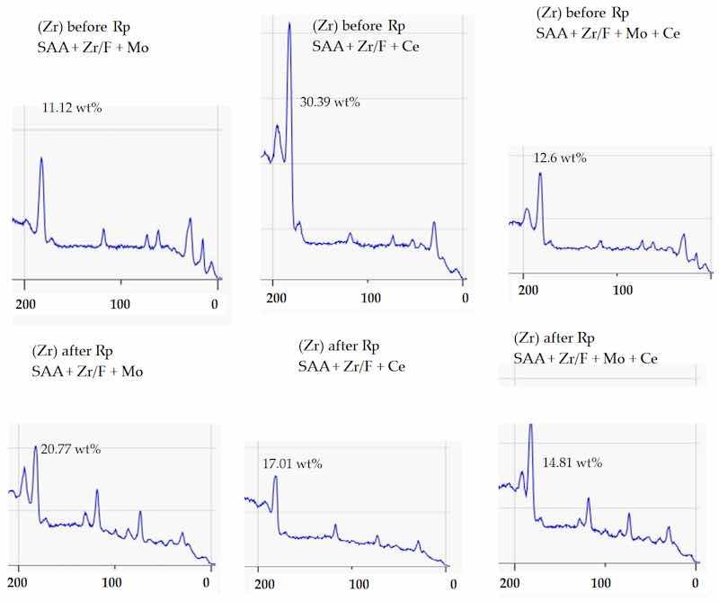 The results obtained for sample 4 (Zr/F + Mo) following the measurement of Rp indicate that, after 216 hr at Eocp, the top part of the conversion layer (up to ~5 nm in thickness) contained only Zr and at an increased concentration (20.77 wt%) from XPS analysis. The remaining characteristic elements of the conversion layer (Mo, F, K, Na, S, Fe) that were detected in the as-deposited sample were apparently present at lower depths of the conversion layer (exceeding 5 nm—the limit of detection of the XPS method), taking into account the EDS analysis for the sample with (Zr/F + Mo). A similar effect was established for sample No. 7 (Zr/F + Ce).