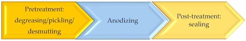 Figure 2. Process flow diagram: pretreatment, anodization, and post-treatment, such as sealing/conversion coatings. In between the different steps of pretreatment, anodization, sealing, and after sealing, rinsing with water must be performed, with water quality depending on the industrial process.