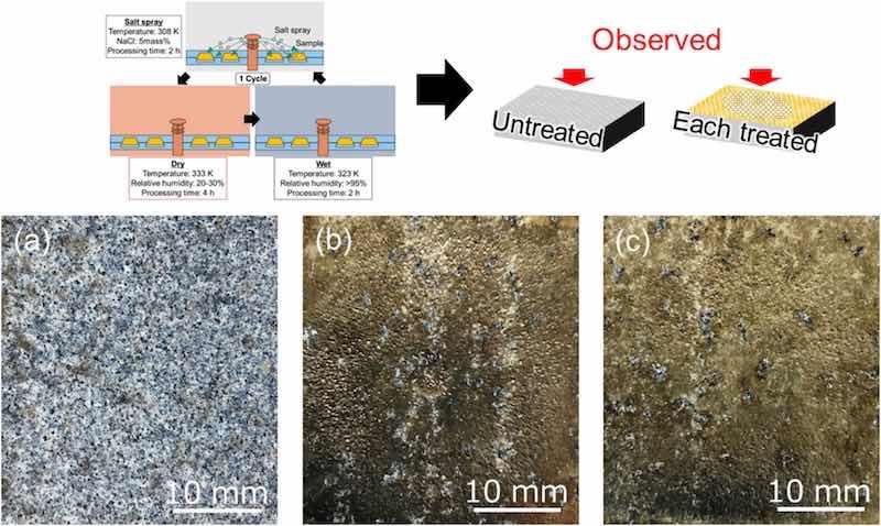 In the combined cycle test, the amount of surface oxidation caused by chlorides was less for each treated sample than for the corresponding untreated sample. In addition, when droplets containing chlorides were dropped onto a surface and the angle of the droplets that adhered to the surface was measured, the angle for the untreated sample remained constant even after the droplets were dropped several times. However, when several droplets were dropped onto each of the cavitation-treated samples, some areas were highly hydrophobic and some areas were less hydrophobic than the untreated samples.