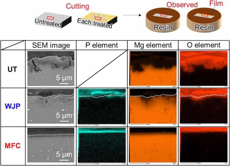 In the present study, we used WJP and MFC as processes to generate cavitation bubbles during phosphating, formed a film on the surface of a Mg alloy, identified the compounds in the film, and evaluated the effect of chlorides on the film.