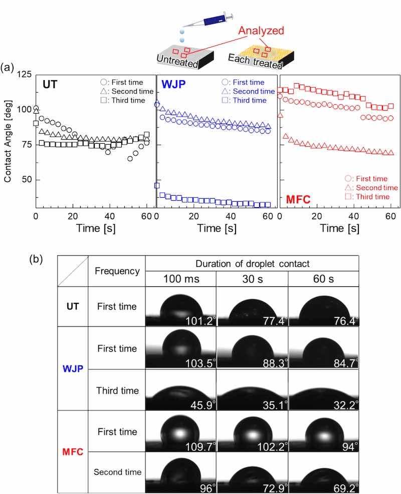 (5) Differences were observed in the droplet angles between the treated samples, and they showed hydrophobic behavior compared with the UT sample.