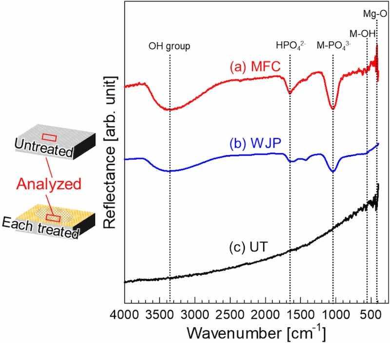 Each treated sample changed from metallic gray to a golden color, consistent with previous studies [[30], [31], [32], [33]]. This golden color is due to the formation of a film on the Mg alloy surface, and a cellular microstructure was observed by SEM (Fig. 3). This microstructure was observed on both the WJP- and MFC-treated surfaces. We have also previously reported that surface treatments with phosphoric acid in the cavitation bubbles slightly reduce hardness and residual stress but form films thicker than 1 μm, as shown in Table 2 [31]. Because the temperature inside the cavitation bubbles differs between WJP and MFC, we identified the chemical compounds in the films formed on the surfaces after the two treatments. The treated surfaces were analyzed by X-ray diffraction (XRD); however, no compounds were identified because the films formed by these treatments were thin. Because the interior of the cavitation bubble changes to a radical state, we conducted an FT-IR analysis to identify the compounds on the basis of the frequency of infrared light absorbed by the molecules.