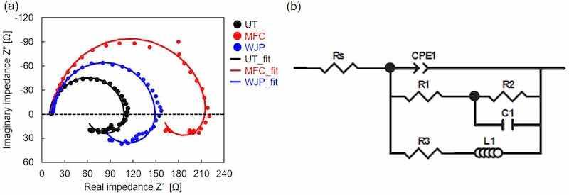 Fig. 7. Electrochemical impedance spectroscopy results: (a) Nyquist diagram for UT, WJP-treated, and MFC-treated samples immersed in 5 mass% NaCl solution for 4 h; (b) electrical equivalent circuit for corroding Mg.