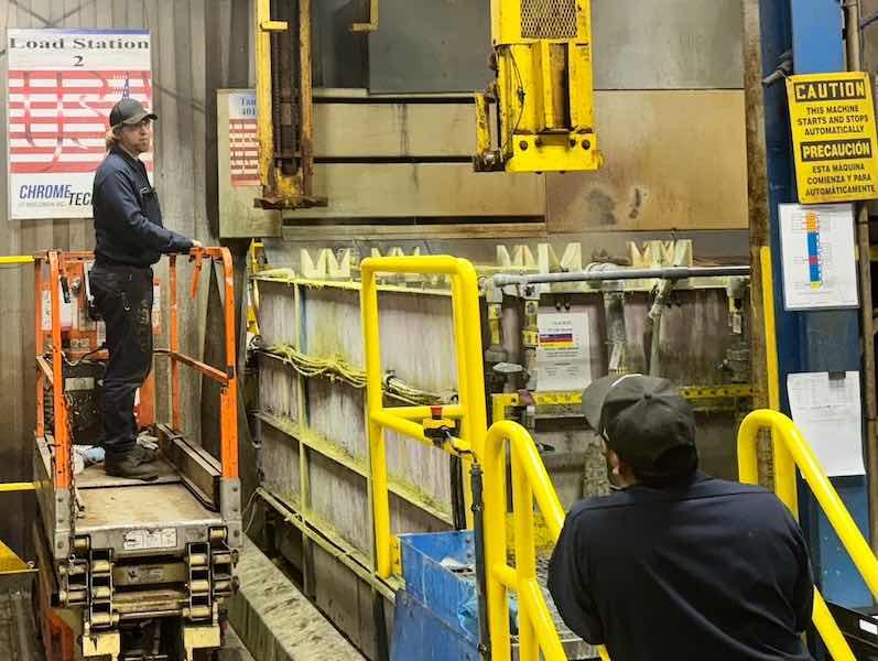 For their hard chrome process, ChromeTech has a large automated line with four cells that can run up to 17 million parts a year and has over 3,000 recipes. They also have manual hard chrome lines.