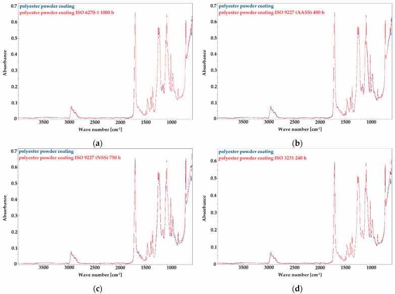 Figure 1: FTIR spectra of polyester topcoat after accelerated corrosion tests according to: (a) ISO 6270-1 for 1000 h; (b) ISO 9227 AASS for 480 h; (c) ISO 9227 NSS for 750 h; (d) ISO 3231 for 240 h.
