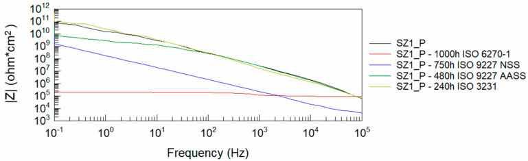 From the Bode impedance modulus plots for the polyester single coating system, it can be observed that the greatest effect on the reduction of the coating’s barrier properties is due to humidity exposure at 1000 h and NSS neutral salt spray exposure at 750 h. The least effect on the impedance level of the polyester coating is observed when tested in a humid atmosphere containing SO2. These results correlate with the evaluation of coating damage according to ISO 4628-2 ÷ 5 and with the assessment of damage according to ISO 4628-8 (coating delamination and corrosion) around the artificial damage. For the EP + P two-coating system, the greatest effect on the reduction of the coating barrier properties is observed after exposure to a humid atmosphere containing SO2.