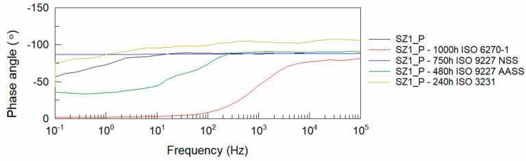 Figure 5: Bode plots of polyester coating before and after accelerated corrosion tests: phase angle θ(f).