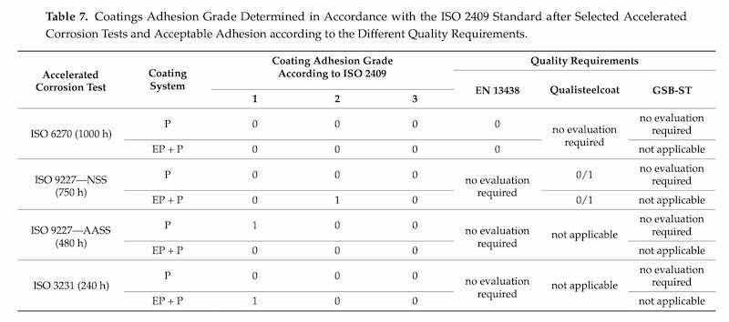 Table 7: Coatings Adhesion Grade Determined in Accordance with the ISO 2409 Standard after Selected Accelerated Corrosion Tests and Acceptable Adhesion according to the Different Quality Requirements.