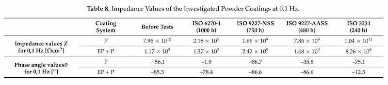 Table 8: Impedance Values of the Investigated Powder Coatings at 0.1 Hz.